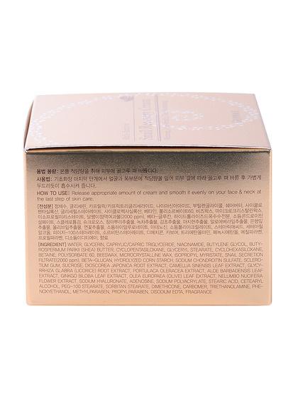 water, snail secretion filtrate, propanediol, glycerin, caprylic/capric triglyceride, butylene glycol, niacinamide, microcrystalline wax, butyrospermum parkii (shea) butter, cyclopentasiloxane, glyceryl stearate, cyclohexasiloxane, betaine, polysorbate 60, beeswax, isopropyl myristate, peg-100 stearate, sodium polyacrylate, cetearyl alcohol, stearic acid, dimethicone, triethanolamine, sorbitan stearae, carbomer, phenoxyethanol, beta-glucan, hydrolyzed corn starch, aloe barbadensis leaf extract, nelumbo nucifera flower extract, methylparaben, ginkgo biloba leaf extract, sucrose, dioscorea japonica root extract, portulaca oleracea extract, olea europaea (olive) leaf extract, 1,2-hexanediol, benzophenone-5, propylparaben, fragrance, glycyrrhiza glabra (licorice) root extract, sodium hyaluronate, camellia sinensis leaf extract, pentylene glycol, adenosine, disodium edta, caprylyl glycol, ethylhexylglycerin, ci 19140