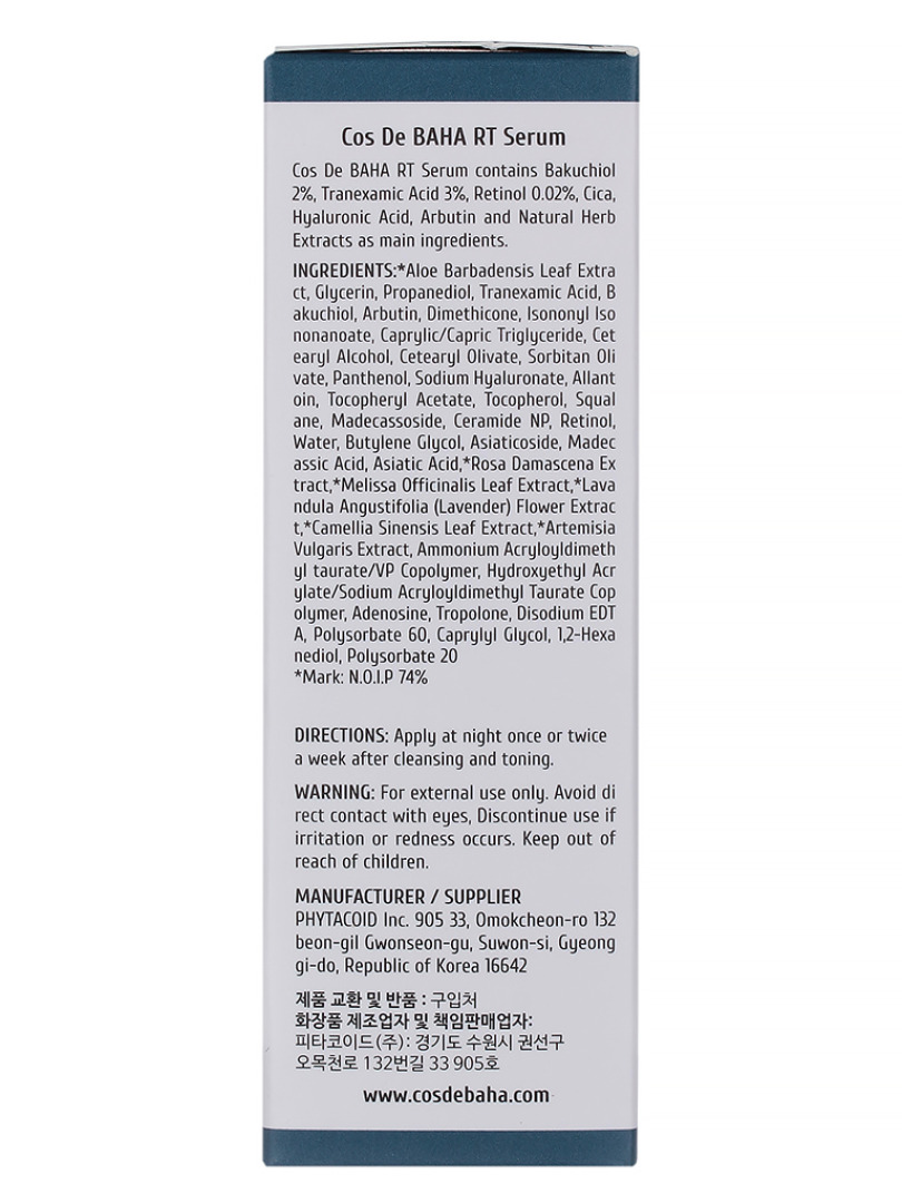 Изг-ль: PHYTACOID Inc., Корея, Республика, 905, 33, Omokcheon-ro 132beon-gil, Gwonseon-gu, Suwon-si, Gyeonggi-do. Сыворотка для лица содержит в качестве основных ингредиентов: бакучиол 2%, транексамовую кислоту 3%, ретинол 0,02 %, а также гиалуроновую кислоту, центеллу азиатскую, арбутин и др. Бакучиол – это растительный аналог ретинола, как и ретинол, оказывает мощное омолаживающее действие - разглаживает морщины, повышает упругость кожи и подтягивает контуры лица. Способ применения: на очищенную и тонизированную кожу нанесите средство. *Средство применять 1-2 раза в неделю, в ночное время.