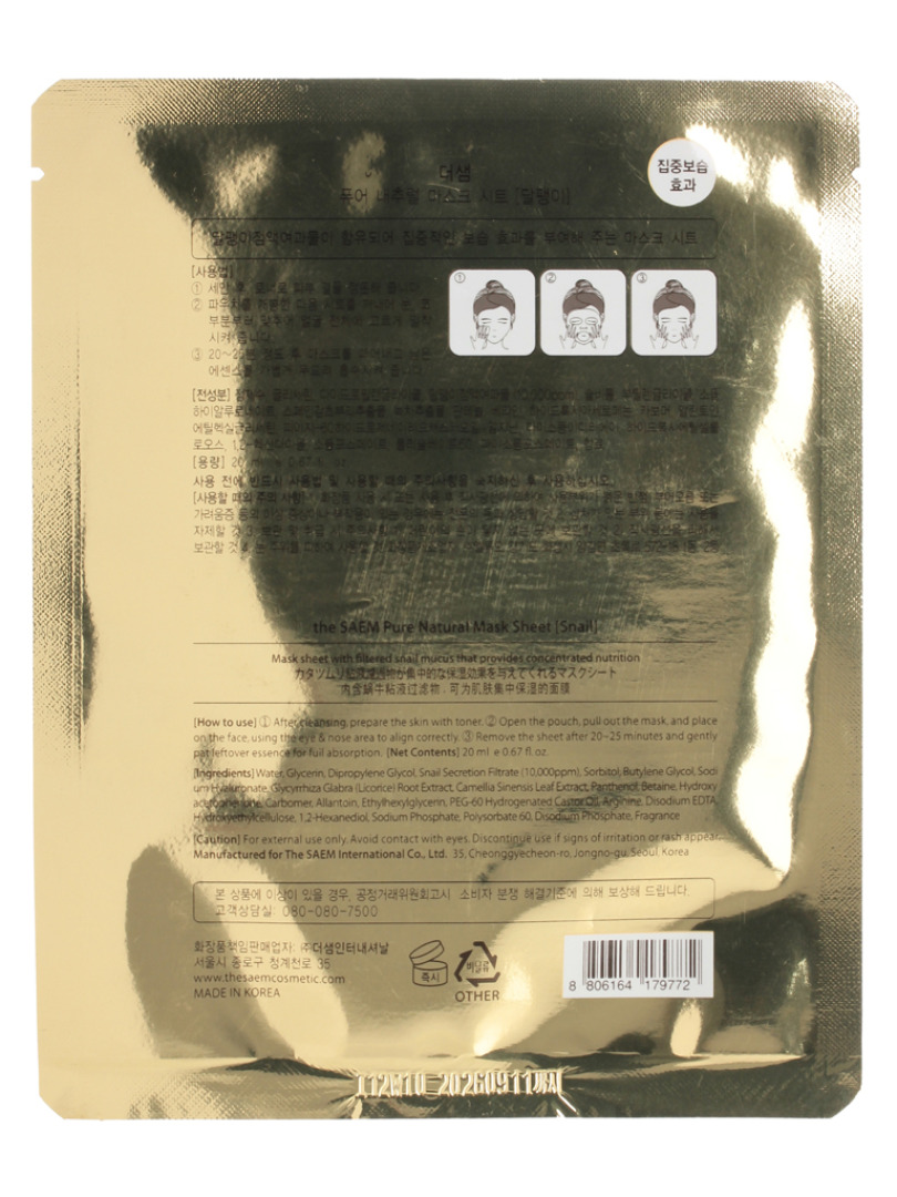 Изг-ль: THE SAEM INTERNATIONAL CO.LTD., КОРЕЯ, РЕСПУБЛИКА, 10F, 35, Cheonggyecheon-ro, Jongno-gu, Seoul. Маска тканевая с муцином улитки обладает великолепным регенирирующим действием, восстанавливает структуру кожи, уменьшает морщинки, увлажняет, питает. Маска с экстрактом улитки содержит полный набор аминокислот, аллантоин, витамины А, С, Е, В6, В12, коллаген, хитозан, эластин. После применения маски, кожа лица становится подтянутой, бархатной и сияющей здоровьем. Способ применения: Нанесите маску на очищенную кожу лица и оставьте на 20-30 минут. Затем снимите маску, легкими похлопывающими движениями помассируйте лицо до полного впитывания маски.