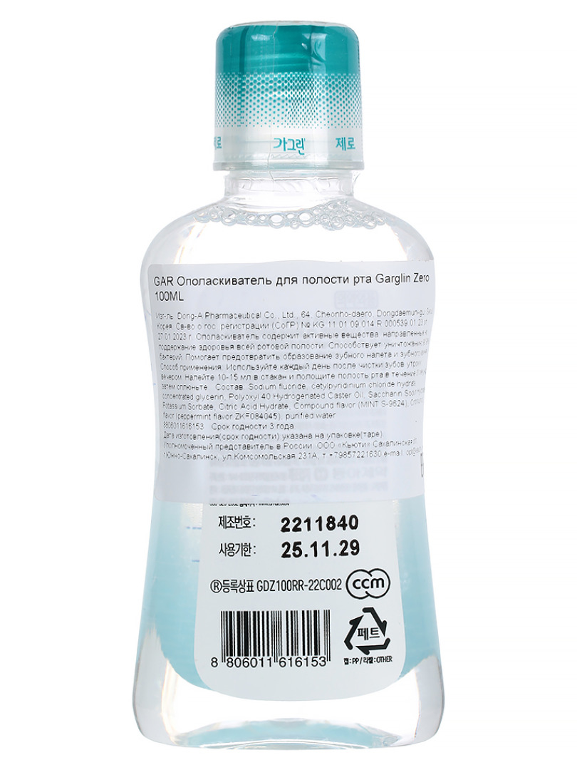 Изг-ль: Dong-A Pharmaceutical Co., Ltd., 64, Cheonho-daero, Dongdaemun-gu, Seoul, Корея. Св-во о гос. регистрации (СоГР) № KG.11.01.09.014.R.000539.01.23 от 27.01.2023 г. Ополаскиватель содержит активные вещества, направленные на поддержание здоровья всей ротовой полости. Способствует уничтожению 99.9% бактерий. Помогает предотвратить образование зубного налета и зубного камня. Способ применения: Используйте каждый день после чистки зубов утром и вечером. Налейте 10-15 мл в стакан и полощите полость рта в течение 30 секунд, затем сплюньте.