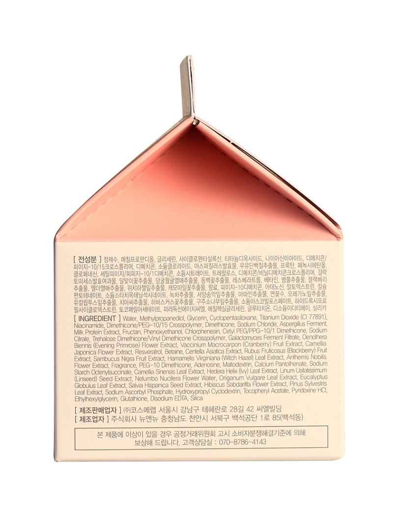 Water, Methylpropanediol, Glycerin, Cyclopentasiloxane, Titanium Dioxide (CI 77891), Niacinamide, Dimethicone/PEG-10/15 Crosspolymer, Dimethicone, Sodium Chloride, Aspergillus Ferment, Milk Protein Extract, Fructan, Phenoxyethanol, Chlorphenesin,
