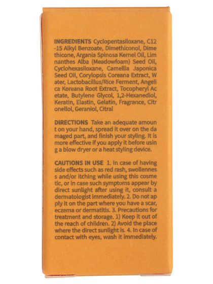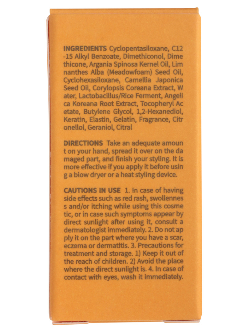 Cyclopentasiloxane, C12-15 Alkyl Benzoate, Dimethiconol, Dimethicone, Fragrance, Argania Spinosa Kernel Oil, Camellia Japonica Seed Oil, Limnanthes Alba (Meadowfoam) Seed Oil, Tocopheryl Acetate, Water, Cyclohexasiloxane, Butylene Glycol, Citronellol, 1,2-Hexanediol, Geraniol, Citral, Angelica Koreana Root Extract, Lactobacillus/Rice Ferment, Corylopsis Coreana Extract, Elastin, Keratin, Gelatin