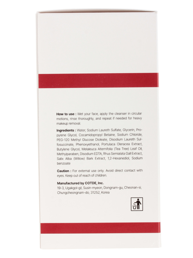 Изг-ль: COTDE Co.Ltd, КОРЕЯ, РЕСПУБЛИКА, 19-3, Ugakgol-gil, Jangsan-ri, Dongnam-gu, Cheonan-si, Chungcheongnam-do. Средство для умывания бережно очищает кожу, не раздражая и не пересушивая кожу. Образует плотную пенку, глубоко очищает поры кожи от загрязнений, остатков макияжа и кожного сала. Содержит масло чайного дерева, успокаивает кожу, препятствует выработке излишнего кожного сала и предупреждает появление воспалений. Особенно рекомендуется для чувствительной кожи. Подходит для всех типов кожи. Применение: вспеньте средство во влажных руках, мягко помассируйте кожу, особое внимание уделяя области Т-зоны и проблемным участкам, тщательно смойте пенку водой.