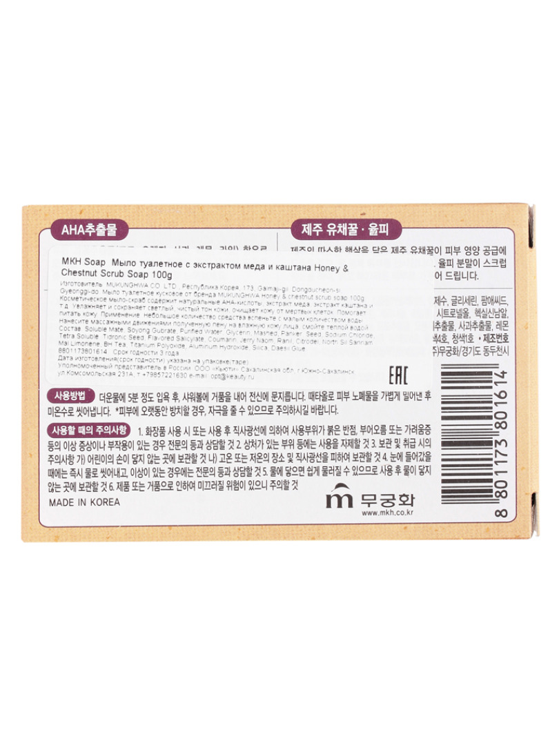 Изготовитель: MUKUNGHWA CO. LTD., Республика Корея, 173, Galmaji-gil, Dongducheon-si, Gyeonggi-do. Мыло туалетное кусковое от бренда MUKUNGHWA Honey & chestnut scrub soap 100g. Косметическое мыло-скраб содержит натуральные АНА-кислоты, экстракт меда, экстракт каштана и т.д. Увлажняет и сохраняет светлый, чистый тон кожи, очищает кожу от мертвых клеток. Помогает питать кожу. Применение: Небольшое количество средства вспеньте с малым количеством воды. Нанесите массажными движениями полученную пену на влажную кожу лица, смойте теплой водой