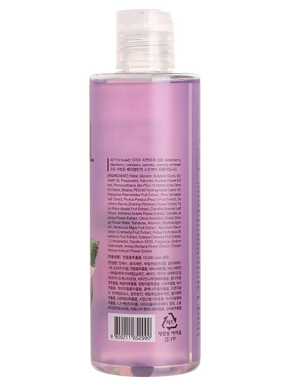 Water, Glycerin, Butylene Glycol, Glycereth-26, Propanediol, Nelumbo Nucifera Flower Extract, Phenoxyethanol, Bis-PEG-18 Methyl Ether Dimethyl Silane, Betaine, PEG-60 Hydrogenated Castor Oil, Hippophae Rhamnoides Fruit Extract, Rhus Semialata Gall Extract, Prunus Persica (Peach) Fruit Extract, Oenothera Biennis, Evening Primrose) Flower Extract, Pyrus Malus (Apple) Fruit Extract, Camellia Sinensis Leaf Extract, Anthemis Nobilis Flower Extract, Camellia Japonica Flower Extract, Citrus Aurantium Dulcis (Orange) Flower Water, Trehalose, Allantoin, Ethylhexylglycerin, Sambucus Nigra Fruit Extract, Vaccinium Macrocarpon (Cranberry) Fruit Extract, Rubus Fruticosus (Blackberry) Fruit Extract, Euterpe Oleracea Fruit Extract, 1,2-Hexanediol, Disodium EDTA, Fragrance, Sodium Hyaluronate, Arnica Montana Flower Extract, Chrysanthemum Indicum Flower Extract
