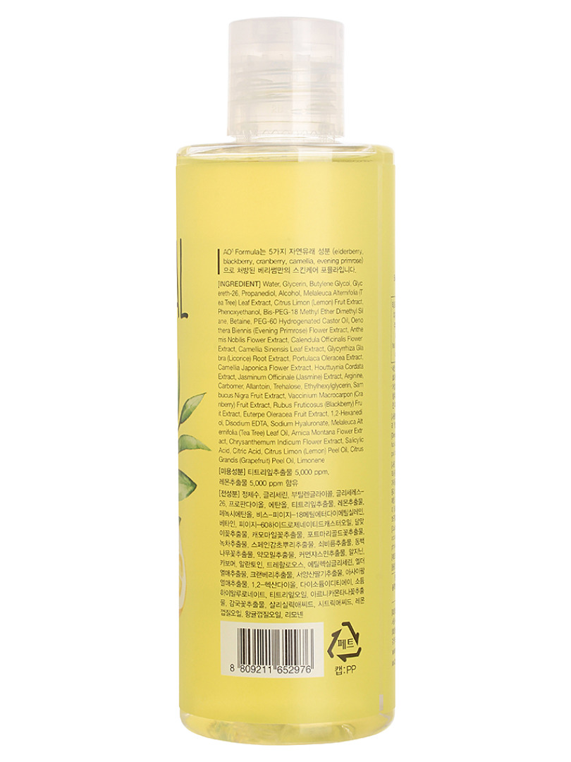 Water, Glycerin, Butylene Glycol, Glycereth-26, Propanediol, Alcohol, Melaleuca Alternifolia (Tea Tree) Leaf Extract, Citrus Limon (Lemon) Fruit Extract, Phenoxyethanol, Bis-PEG-18 Methyl Ether Dimethyl Silane, Betaine, PEG-60 Hydrogenated Castor Oil, Oenothera Biennis (Evening Primrose) Flower Extract, Anthemis Nobilis Flower Extract, Calendula Officinalis Flower Extract, Camellia Sinensis Leaf Extract, Glycyrrhiza Glabra (Licorice) Root Extract, Portulaca Oleracea Extract, Camellia Japonica Flower Extract, Houttuynia Cordata Extract, Jasminum Officinale (Jasmine) Extract, Arginine, Carbomer, Allantoin, Trehalose, Ethylhexylglycerin, Sambucus Nigra Fruit Extract, Vaccinium Macrocarpon (Cranberry) Fruit Extract, Rubus Fruticosus (Blackberry) Fruit Extract, Euterpe Oleracea Fruit Extract, 1,2-Hexanediol, Disodium EDTA, Citrus Limon (Lemon) Peel Oil, Sodium Hyaluronate, Melaleuca Alternifolia (Tea Tree) Leaf Oil, Arnica Montana Flower Extract, Chrysanthemum Indicum Flower Extract, Salicylic Acid, Citric Acid, Citrus Grandis (Grapefruit) Peel Oil