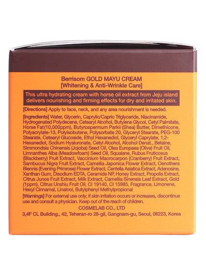 Water, Glycerin, Caprylic/Capric Triglyceride, Niacinamide, Hydrogenated Polydecene, Cetearyl Alcohol, Butylene Glycol, Cetyl Palmitate, Butyrospermum Parkii (Shea) Butter, Dimethicone, Horse Fat, Polyacrylate-13, Polyisobutene,Polysorbate 20, Glyceryl Stearate, PEG-100 Stearate, Cetearyl Glucoside, Ethyl Hexanediol, Glyceryl Caprylate, Sodium Hyaluronate, Cetyl Alcohol, Alcohol Denat. Betaine, Simmondsia Chinensis (Jojoba) Seed Oil, Olea Europaea (Olive) Fruit Oil, Limnanthes Alba (Meadowfoam) Seed Oil, Squalane, Rubus Fruticosus (Blackberry) Fruit Extract, Vaccinium Macrocarpon (Cranberry) Fruit Extract, Sambucus Nigra Fruit Extract, Camellia Japonica Flower Extract, Oenothera Biennis (Evening Primrose) Flower Extract, Centella Asiatica Extract, Adenosine, Xanthan Gum,Disodium EDTA, Ceramide 3, Honey Extract, Propolis Extract, Citrus Junos Fruit Extract, Milk Extract, Camellia Sinensis Leaf Extract, Gold, Citrus Unshiu Fruit Oil, Fragrance, CI 19140, CI 15985