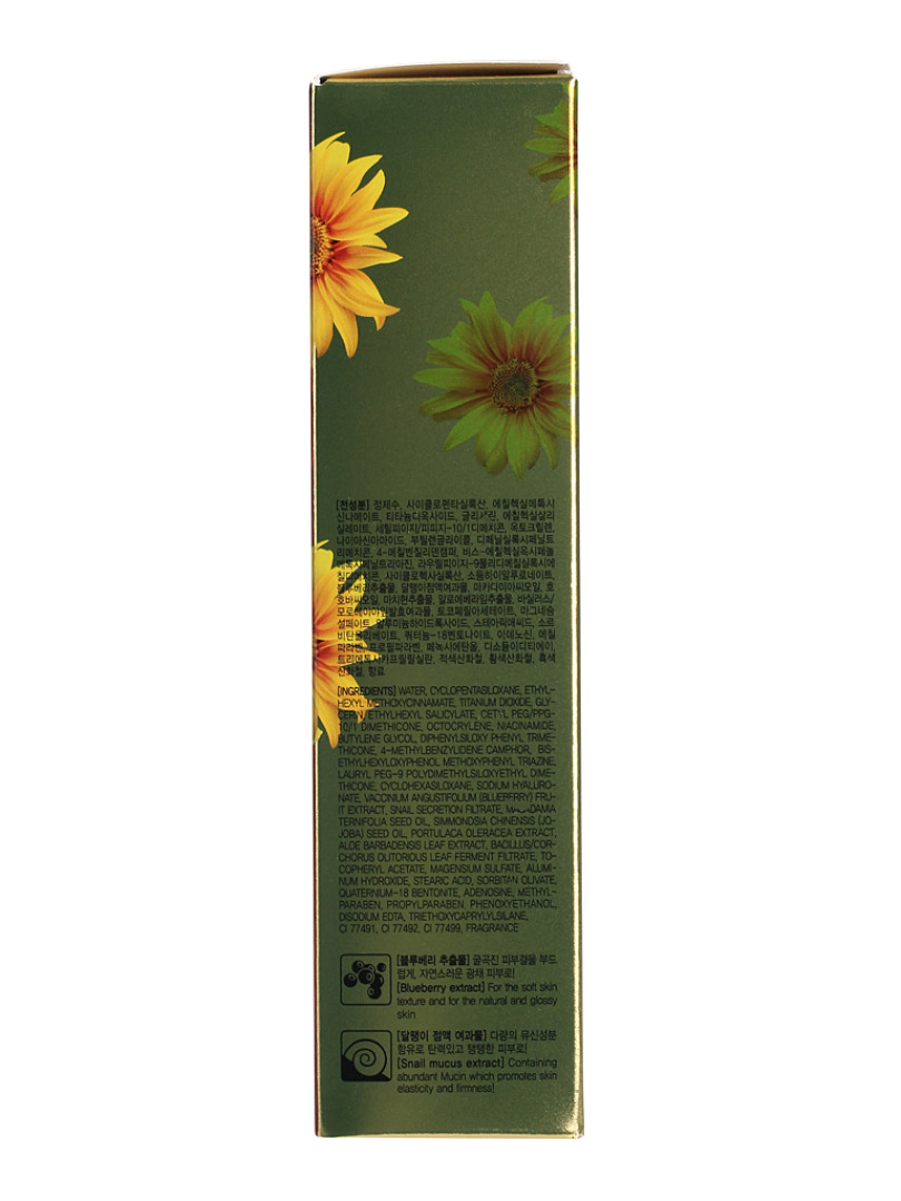 Water, Cyclopentasiloxane, Ethylhexyl methoxycinnamate, Titanium dioxide, Glycerin, Ethylhexyl salicylate, Cetyl peg/ppg-10/1 dimethicone, Octocrylene, Niacinamide, Butylene glycol, Diphenylsiloxy phenyl trimethicone, 4-methylbenzylidene camphor, Bis-ethylhexyloxyphenol methoxyphenyl triazine, Lauryl peg-9 polydimethylsiloxyethyl dimethicone, Cyclohexasiloxane, Sodium hyaluronate, Vaccinium angustifolium (blueberry) fruit extract, Snail secretion filtrate , Macadamia ternifolia seed oil, Simmondsia chinensis (jojoba) seed oil, Portulaca oleracea extract, Aloe barbadensis leaf extract, Bacillus/corchorus olitorius leaf ferment filtrate, Tocopheryl acetate, Magnesium sulfate, Aluminum hydroxide, Stearic acid, Sorbitan olivate, Quaternium-18 bentonite, Adenosine, Methylparaben, Propylparaben, Phenoxyethanol, Disodium edta, Triethoxycaprylylsilane, Ci 77491, Ci 77492, Ci 77499, Fragrance, Vegetable oil, Propanediol, Quartz , 1,2-hexanediol, Tocopherol, Pentylene glycol, Caprylyl glycol