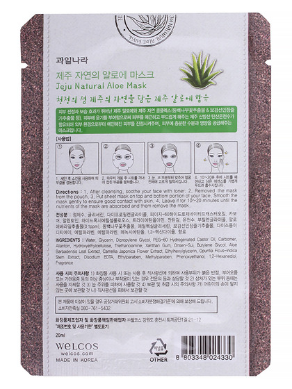 Welcos Co., LTD., 21-12, Toegyegongdan 1-gil, Chuncheon-si, Gangwon-do, Korea Маска на тканевой основе (для лица и тела) бренда Confume Aloe Mask. Содержит в себе увлажняющий компонент алоэ вера, который насытит сухую кожу живительной влагой и устранит небольшие недочеты, такие как акне, покраснения и раздражения. Помимо алоэ вера, маска богата натуральными органическими веществами.