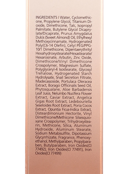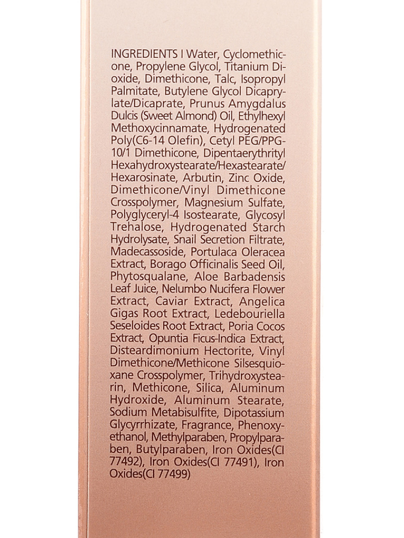 Water, Cyclomethicone, Propylene Glycol, Titanium Dioxide, Dimethicone, Isopropyl Palmitate, Talc, Butylene Glycol Dicaprylate/Dicaprate, Prunus Amygdalus Dulcis (Sweet Almond) Oil, Ethylhexyl Methoxycinnamate, Hydrogenated Poly(C6-14 Olefin), Cetyl PEG/PPG-10/1 Dimethicone, Dipentaerythrityl Hexahydroxystearate/Hexastearate/Hexarosinate, Arbutin, Zinc Oxide, Dimethicone/Vinyl Dimethicone Crosspolymer, Magnesium Sulfate, Polyglyceryl-4 Isostearate, Snail Secretion Filtrate, Borago Officinalis Seed Oil, Portulaca Oleracea Extract, Aloe Barbadensis Leaf Juice, Nelumbo Nucifera Flower Extract, Caviar Extract, Opuntia Ficus-Indica Extract, Disteardimonium Hectorite, Vinyl Dimethicone/Methicone Silsesquioxane Crosspolymer, Trihydroxystearin, Methicone, Glycosyl Trehalose, Hydrogenated Starch Hydrolysate, Silica Dimethyl Silylate, Ethylhexylglycerin, Aluminum Hydroxide, Aluminum Stearate, Sodium Metabisulfite, Dipotassium Glycyrrhizate, Madecassoside, Phytosqualane, Butylene Glycol, Fragrance, Phenoxyethanol, Iron Oxides(CI 77492), Iron Oxides(CI 77491), Iron Oxides(CI 77499)