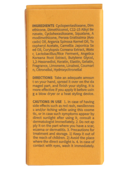 Cyclopentasiloxane, Dimethicone, Dimethiconol, C12-15 Alkyl Benzoate, Cyclohexasiloxane, Squalane, Amodimethicone, Persea Gratissima (Avocado) Oil, Fragrance, Argania Spinosa Kernel Oil, Camellia Japonica Seed Oil, Tocopheryl Acetate, Water, Butylene Glycol, Limonene, Linalool, 1,2-Hexanediol, Coumarin, Citronellol, Hydroxycitronellal, Angelica Koreana Root Extract, Lactobacillus/Rice Ferment, Corylopsis Coreana Extract, Elastin, Keratin, Gelatin