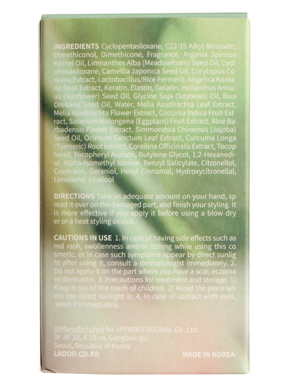Cyclopentasiloxane, C12-15 Alkyl Benzoate, Dimethiconol, Dimethicone, Fragrance, Argania Spinosa Kernel Oil, Camellia Japonica Seed Oil, Limnanthes Alba (Meadowfoam) Seed Oil, Tocopheryl Acetate, Water, Cyclohexasiloxane, Helianthus Annuus (Sunflower) Seed Oil, Benzyl Salicylate, Linalool, Melia Azadirachta Leaf Extract, Hexyl Cinnamal, Melia Azadirachta Flower Extract, Hydroxycitronellal, Citronellol, Butylene Glycol, Glycine Soja (Soybean) Oil, Coccinia Indica Fruit Extract, Alpha-Isomethyl Ionone, Limonene, 1,2-Hexanediol, Aloe Barbadensis Flower Extract, Solanum Melongena (Eggplant) Fruit Extract, Geraniol, Coumarin, Simmondsia Chinensis (Jojoba) Seed Oil, Angelica Koreana Root Extract, Corallina Officinalis Extract, Curcuma Longa (Turmeric) Root Extract, Lactobacillus/Rice Ferment, Ocimum Sanctum Leaf Extract, Bixa Orellana Seed Oil, Corylopsis Coreana Extract, Elastin, Keratin, Tocopherol, Gelatin