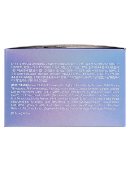 Mineral Oil, Cetyl Ethylhexanoate, Ethylhexyl Palmitate, Synthetic Wax, PEG-5 Glyceryl Triisostearate, PEG-10 Isostearate, Fragrance, Hexyl Cinnamal, Linalool, Limonene, Camellia Japonica Seed Oil, Vitis Vinifera (Grape) Seed Oil, Water, Butylene Glycol, Glycerin, 1,2-Hexanediol, Prunus Persica (Peach) Fruit Extract, Citrullus Lanatus (Watermelon) Fruit Extract, Sodium Hyaluronate, Coptis Japonica Root Extract, Lactobacillus Ferment, Stellaria Media (Chickweed) Extract, Litchi Chinensis Fruit Extract, Ficus Carica (Fig) Fruit Extract, Rubus Crataegifolius Fruit Extract, Hydrolyzed Collagen, Punica Granatum Fruit Extract, Hylocereus Undatus Fruit Extract, Prunus Serotina (Wild Cherry) Fruit Extract, Hydrolyzed Hyaluronic Acid, Citrus Paradisi (Grapefruit) Fruit Extract, Sodium Acetylated Hyaluronate, Wine Extract