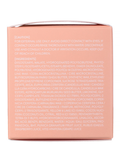 Diisostearyl Malate, Hydrogenated Polyisobutene, Phytosteryl/Isostearyl/Cetyl/Stearyl/Behenyl Dimer Dilinoleate, Polybutene, Hydrogenated Poly(C6-14 Olefin), Microcrystalline Wax / Cera Microcristallina / Cire Microcristalline, Butyrospermum Parkii (Shea) Butter, Synthetic Wax, Ethylene/Propylene/Styrene Copolymer, Sucrose Tetrastearate Triacetate, Mica, Euphorbia Cerifera (Candelilla) Wax / Candelilla Cera Hydrocarbons / Cire De Candelilla, Candelilla Wax Esters, Astrocaryum Mu- Rumuru Seed Butter, Limonene, Glyceryl Caprylate, Titanium Dioxide (Ci 77891), Polyglyceryl-2 Diiso- Stearate, Butylene/Ethylene/Styrene Copolymer, Copernicia Cerifera (Carnauba) Wax / Copernicia Cerifera Cera / Cire De Carnauba, Fragrance / Parfum, Methicone, Polyglyceryl-2 Triisostearate, Yellow 6 Lake (Ci 15985), Cocos Nucifera (Coconut) Oil, Citral, Red 6 (Ci 15850), Pentaerythrityl Tetra -Di-T-Butyl Hydroxyhydrocinnamate, Linalool, Ascorbic Acid, Benzyl Benzoate, Water / Aqua / Eau, Glycerin, Propanediol, Bht, Punica Granatum Fruit Juice, Rubus Idaeus (Raspberry) Juice, Vitis Vinifera (Grape) Juice