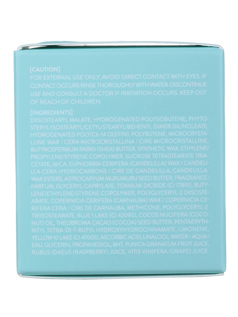 Diisostearyl Malate, Hydrogenated Polyisobutene, Phytosteryl/Isostearyl/Cetyl/Stearyl/Behenyl Dimer Dilinoleate, Hydrogenated Poly(C6-14 Olefin), Polybutene, Microcrystalline Wax / Cera Micro- Cristallina / Cire Microcristalline, Butyrospermum Parkii (Shea) Butter, Synthetic Wax, Ethylene/Pro- Pylene/Styrene Copolymer, Sucrose Tetrastearate Triacetate, Mica, Euphorbia Cerifera (Candelilla) Wax / Candelilla Cera Hydrocarbons / Cire De Candelilla, Candelilla Wax Esters, Astrocaryum Mu- Rumuru Seed Butter, Fragrance / Parfum, Glyceryl Caprylate, Titanium Dioxide (Ci 77891), Butylene/ Ethylene/Styrene Copolymer, Polyglyceryl-2 Diisostearate, Copernicia Cerifera (Carnauba) Wax / Copernicia Cerifera Cera / Cire De Carnauba, Methicone, Polyglyceryl-2 Triisostearate, Blue 1 Lake (Ci 42090), Cocos Nucifera (Coconut) Oil, Theobroma Cacao (Cocoa) Seed Butter, Pentaerythrityl Tetra-Di-T-Butyl Hydroxyhydrocinnamate, Limonene, Yellow 10 Lake (Ci 47005), Ascorbic Acid, Linalool, Water / Aqua / Eau, Glycerin, Propanediol, Bht, Punica Granatum Fruit Juice, Rubus Idaeus (Raspberry) Juice, Vitis Vinifera (Grape) Juice