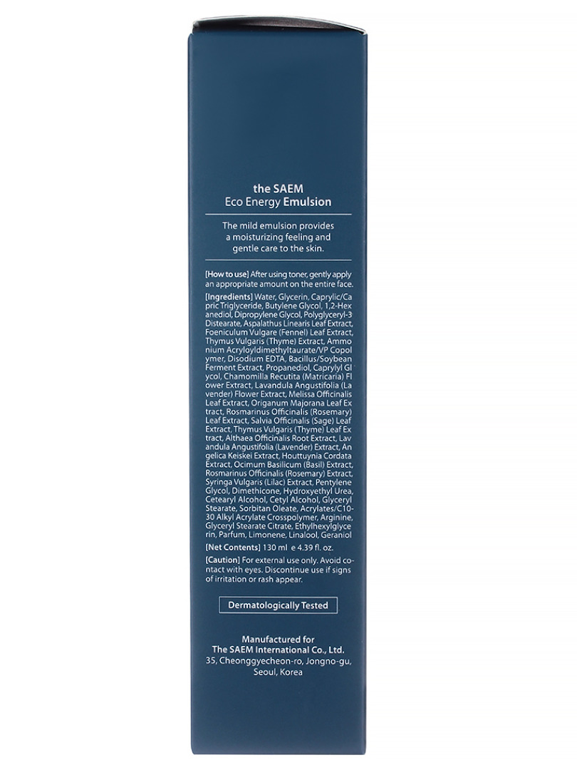 Изг-ль: THE SAEM INTERNATIONAL CO.LTD., КОРЕЯ, РЕСПУБЛИКА, 10F, 35, Cheonggyecheon-ro, Jongno-gu, Seoul. Мягкая эмульсия на основе французского чайно-водного комплекса и 5 экстрактов трав, наполняет кожу влагой и энергией, обеспечивает комфортный уход за кожей. Ингредиенты, извлеченные из 7 различных растений, помогают увлажнить кожу, делает ее мягкой и гладкой. Гипоаллергенное средство. Способ применения: после нанесения тонера нанесите необходимое количество средства и распределите по коже.