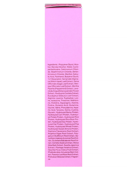 Propylene Glycol, Alcohol, Myristyl Alcohol, Water, Cyclopentasiloxane, Cetrimonium Chloride, Steartrimonium Chloride, Behentrimonium Chloride, Fragrance, Menthol, Salicylic Acid, Panthenol, Butylene Glycol, 1,2-Hexanediol, Hamamelis Virginiana (Witch Hazel), Leaf Extract", Salvia Officinalis (Sage) Leaf Extract, Melissa Officinalis Leaf Extract, Mentha Piperita (Peppermint) Extract, "Lavandula Angustifolia (Lavender), Flower Extract", Houttuynia Cordata Extract, Eucalyptus Globulus Leaf Extract, Arginine, Leucine, Tryptophan, Lysine, Isoleucine, Threonine, Methionine, Histidine, Asparagine, Alanine, Proline, Glutamic Acid, Glutamine, Glycine, Valine, Phenylalanine, Aspartic Acid, Tyrosine, Serine, Cystine, Glycerin, Hydrolyzed Barley Protein, Hydrolyzed Corn Protein, Hydrolyzed Potato Protein, Hydrolyzed Rice Protein, Hydrolyzed Rice Bran Protein, Hydrolyzed Soy Protein, Hydrolyzed Oat Protein, Hydrolyzed Pea Protein, Hydrolyzed Wheat Protein, Hydrolyzed Sweet Almond Protein, Sophora Flavescens Root Extract, Angelica Gigas Root Extract, Polygonum Multiflorum Root Extract, "Glycyrrhiza Uralensis (Licorice) Root, Extract", Scutellaria Baicalensis Root Extract, Centella Asiatica Extract, Morus Alba Bark Extract, Swertia Japonica Extract, Plantago Asiatica Extract, Opuntia Ficus-Indica Fruit Extract, Phellodendron Amurense Bark Extract, Paeonia Lactiflora Root Extract, Portulaca Oleracea Extract