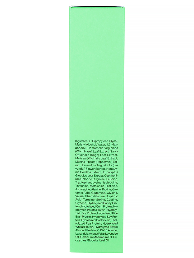 Dipropylene Glycol, Myristyl Alcohol, Water, 1,2-Hexanediol, "Hamamelis Virginiana (Witch Hazel), Leaf Extract", Salvia Officinalis (Sage) Leaf Extract, Melissa Officinalis Leaf Extract, Mentha Piperita (Peppermint) Extract, "Lavandula Angustifolia (Lavender), Flower Extract", Houttuynia Cordata Extract, Eucalyptus Globulus Leaf Extract, Cetrimonium Chloride, Arginine, Leucine, Tryptophan, Lysine, Isoleucine, Threonine, Methionine, Histidine, Asparagine, Alanine, Proline, Glutamic Acid, Glutamine, Glycine, Valine, Phenylalanine, Aspartic Acid, Tyrosine, Serine, Cystine, Glycerin, Hydrolyzed Barley Protein, Hydrolyzed Corn Protein, Hydrolyzed Potato Protein, Hydrolyzed Rice Protein, Hydrolyzed Rice Bran Protein, Hydrolyzed Soy Protein, Hydrolyzed Oat Protein, Hydrolyzed Pea Protein, Hydrolyzed Wheat Protein, Hydrolyzed Sweet Almond Protein, C13-15 Alkane, Lavandula Angustifolia (Lavender) Oil, Geranium Maculatum Oil, Eucalyptus Globulus Leaf Oil