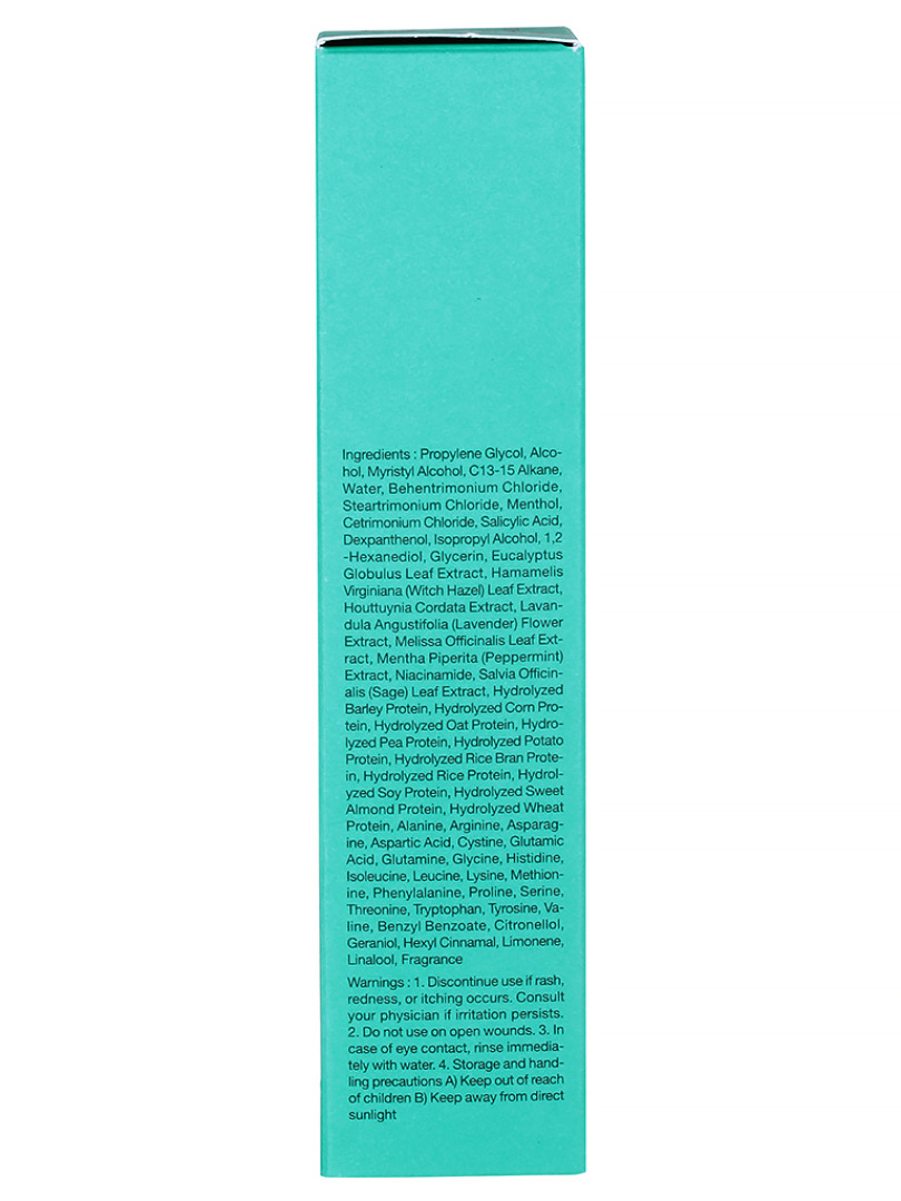Propylene Glycol, Alcohol, Water, Myristyl Alcohol, C13-15 Alkane, Cetrimonium Chloride, Steartrimonium Chloride, Behentrimonium Chloride, Isopropyl Alcohol, 1,2-Hexanediol, "Hamamelis Virginiana (Witch Hazel), Leaf Extract", Salvia Officinalis (Sage) Leaf Extract, Melissa Officinalis Leaf Extract, Mentha Piperita (Peppermint) Extract, "Lavandula Angustifolia (Lavender), Flower Extract", Houttuynia Cordata Extract, Eucalyptus Globulus Leaf Extract, Glycerin, Hydrolyzed Barley Protein, Hydrolyzed Corn Protein, Hydrolyzed Potato Protein, Hydrolyzed Rice Protein, Hydrolyzed Rice Bran Protein, Hydrolyzed Soy Protein, Hydrolyzed Oat Protein, Hydrolyzed Pea Protein, Hydrolyzed Wheat Protein, Hydrolyzed Sweet Almond Protein, Arginine, Leucine, Tryptophan, Lysine, Isoleucine, Threonine, Methionine, Histidine, Asparagine, Alanine, Proline, Glutamic Acid, Glutamine, Glycine, Valine, Phenylalanine, Aspartic Acid, Tyrosine, Serine, Cystine, Menthol, Salicylic Acid, Dexpanthenol, Niacinamide, "Fragrance (Benzyl Benzoate, Citronellol, Geraniol, Hexyl, Cinnamal,Limonene, Linalool)