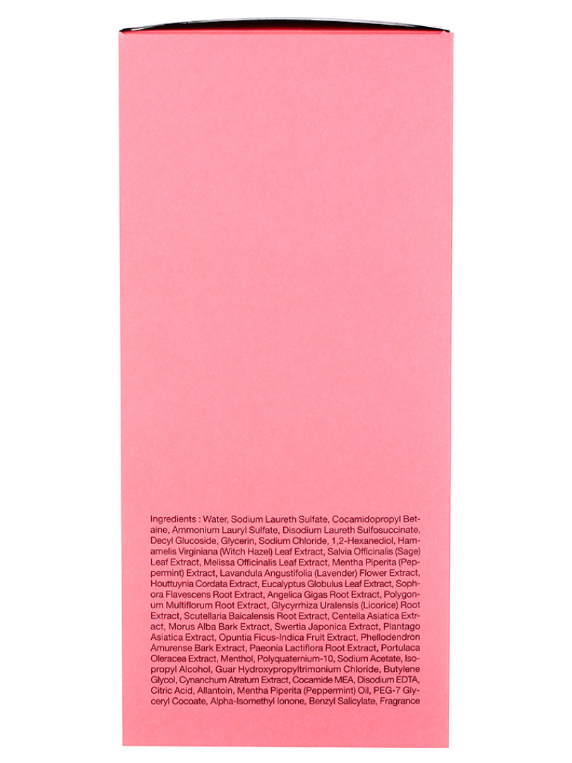 Water, Sodium Laureth Sulfate, Cocamidopropyl Betaine, Sodium Chloride, Ammonium Lauryl Sulfate, Disodium Laureth Sulfosuccinate, Decyl Glucoside, Glycerin, 1,2-Hexanediol, "Hamamelis Virginiana (Witch Hazel), Leaf Extract", Salvia Officinalis (Sage) Leaf Extract, Melissa Officinalis Leaf Extract, Mentha Piperita (Peppermint) Extract, "Lavandula Angustifolia (Lavender), Flower Extract", Houttuynia Cordata Extract, Eucalyptus Globulus Leaf Extract, Sophora Flavescens Root Extract, Angelica Gigas Root Extract, Polygonum Multiflorum Root Extract, "Glycyrrhiza Uralensis (Licorice) Root, Extract", Scutellaria Baicalensis Root Extract, Centella Asiatica Extract, Morus Alba Bark Extract, Swertia Japonica Extract, Plantago Asiatica Extract, Opuntia Ficus-Indica Fruit Extract, Phellodendron Amurense Bark Extract, Paeonia Lactiflora Root Extract, Portulaca Oleracea Extract, "Fragrance (Alpha-Isomethyl Ionone,, Benzyl Salicylate)", Menthol, Polyquaternium-10, Sodium Acetate, Isopropyl Alcohol, "Guar Hydroxypropyltrimonium, Chloride", Butylene Glycol, Cynanchum Atratum Extract, Cocamide MEA, Disodium EDTA, Citric Acid, Allantoin, Mentha Piperita (Peppermint) Oil, PEG-7 Glyceryl Cocoate