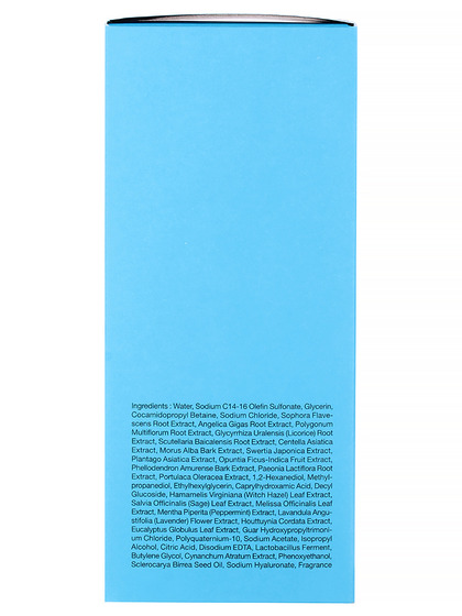 Water, Sodium C14-16 Olefin Sulfonate, Cocamidopropyl Betaine, Sodium Chloride, Glycerin, Sophora Flavescens Root Extract, Angelica Gigas Root Extract, Polygonum Multiflorum Root Extract, Houttuynia Cordata Extract, "Glycyrrhiza Uralensis (Licorice) Root, Extract", Scutellaria Baicalensis Root Extract, Centella Asiatica Extract, Morus Alba Bark Extract, Swertia Japonica Extract, Plantago Asiatica Extract, Opuntia Ficus-Indica Fruit Extract, Phellodendron Amurense Bark Extract, Paeonia Lactiflora Root Extract, Portulaca Oleracea Extract, 1,2-Hexanediol, Methylpropanediol, Ethylhexylglycerin, Caprylhydroxamic Acid, Decyl Glucoside, 1,2-Hexanediol, "Hamamelis Virginiana (Witch Hazel), Leaf Extract", Salvia Officinalis (Sage) Leaf Extract, Melissa Officinalis Leaf Extract, Mentha Piperita (Peppermint) Extract, "Lavandula Angustifolia (Lavender), Flower Extract", Eucalyptus Globulus Leaf Extract, Fragrance, "Guar Hydroxypropyltrimonium, Chloride", Polyquaternium-10, Sodium Acetate, Isopropyl Alcohol, Citric Acid, Disodium EDTA, Lactobacillus Ferment, Butylene Glycol, Cynanchum Atratum Extract, Phenoxyethanol, Sclerocarya Birrea Seed Oil, Sodium Hyaluronate