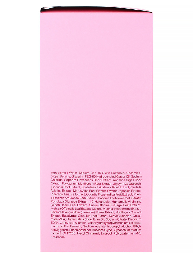 Water, Sodium C14-16 Olefin Sulfonate, Cocamidopropyl Betaine, Sodium Chloride, Glycerin, PEG-60 Hydrogenated Castor Oil, Sophora Flavescens Root Extract, Angelica Gigas Root Extract, Polygonum Multiflorum Root Extract, Houttuynia Cordata Extract, "Glycyrrhiza Uralensis (Licorice) Root, Extract", Scutellaria Baicalensis Root Extract, Centella Asiatica Extract, Morus Alba Bark Extract, Swertia Japonica Extract, Plantago Asiatica Extract, Opuntia Ficus-Indica Fruit Extract, Phellodendron Amurense Bark Extract, Paeonia Lactiflora Root Extract, Portulaca Oleracea Extract, 1,2-Hexanediol, Fragrance (Hexyl Cinnamal, Linalool), Polyquaternium-10, Sodium Acetate, Isopropyl Alcohol, "Hamamelis Virginiana (Witch Hazel), Leaf Extract", Salvia Officinalis (Sage) Leaf Extract, Melissa Officinalis Leaf Extract, Mentha Piperita (Peppermint) Extract, "Lavandula Angustifolia (Lavender), Flower Extract", Eucalyptus Globulus Leaf Extract, Decyl Glucoside, Cocamide MEA, Oryza Sativa (Rice) Bran Oil, Sodium Citrate, Disodium EDTA, Citric Acid, Allantoin, "Guar Hydroxypropyltrimonium, Chloride", Lactobacillus Ferment, Ethylhexylglycerin, Phenoxyethanol, Butylene Glycol, Cynanchum Atratum Extract, CI 17200