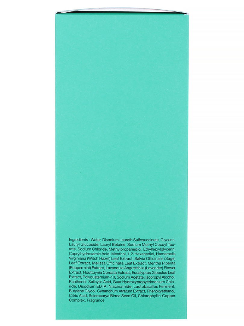 Water, Disodium Laureth Sulfosuccinate, Lauryl Betaine, Sodium Chloride, Lauryl Glucoside, Glycerin, Sodium Methyl Cocoyl Taurate, Methylpropanediol, Ethylhexylglycerin, Caprylhydroxamic Acid, Fragrance, Menthol, 1,2-Hexanediol, Hamamelis Virginiana (Witch Hazel), Leaf Extract", Salvia Officinalis (Sage) Leaf Extract, Melissa Officinalis Leaf Extract, Mentha Piperita (Peppermint) Extract, "Lavandula Angustifolia (Lavender), Flower Extract", Houttuynia Cordata Extract, Eucalyptus Globulus Leaf Extract, Polyquaternium-10, Sodium Acetate, Isopropyl Alcohol, Panthenol, Salicylic Acid, "Guar Hydroxypropyltrimonium, Chloride", Disodium EDTA, Niacinamide, Lactobacillus Ferment, Butylene Glycol, Cynanchum Atratum Extract, Phenoxyethanol, Citric Acid, Sclerocarya Birrea Seed Oil, Chlorophyllin-Copper Complex