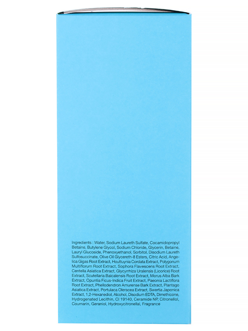 Water, Sodium Laureth Sulfate, Cocamidopropyl Betaine, Sodium Chloride, Butylene Glycol, Glycerin, Lauryl Glucoside, Alcohol, Disodium Laureth Sulfosuccinate, Sorbitol, Betaine, Sophora Flavescens Root Extract, Angelica Gigas Root Extract, Polygonum Multiflorum Root Extract, Houttuynia Cordata Extract, "Glycyrrhiza Uralensis (Licorice) Root, Extract", Scutellaria Baicalensis Root Extract, Centella Asiatica Extract, Morus Alba Bark Extract, Swertia Japonica Extract, Plantago Asiatica Extract, Opuntia Ficus-Indica Fruit Extract, Phellodendron Amurense Bark Extract, Paeonia Lactiflora Root Extract, Portulaca Oleracea Extract, 1,2-Hexanediol, Phenoxyethanol, Dimethicone, Hydrogenated Lecithin, Ceramide NP, Olive Oil Glycereth-8 Esters, Citric Acid, Disodium EDTA, CI 19140, "Fragrance (Citronellol, Coumarin,, Geraniol, Hydroxycitronellal)