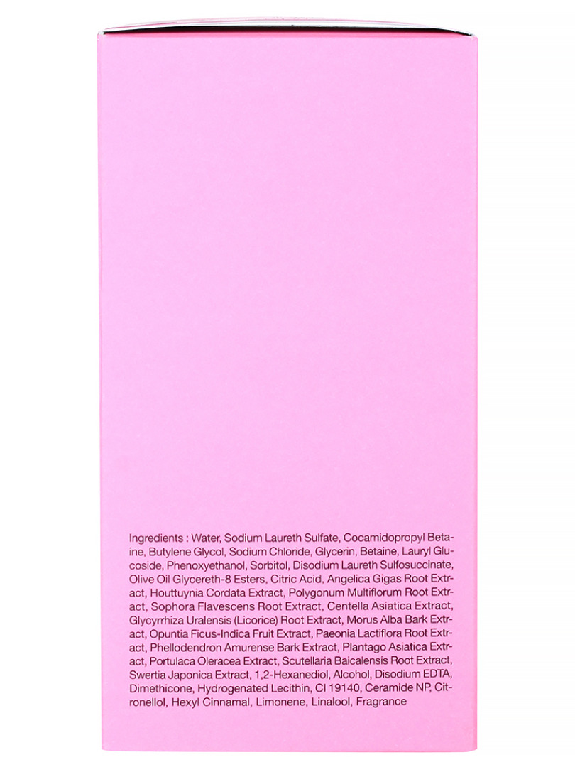 Water, Sodium Laureth Sulfate, Cocamidopropyl Betaine, Sodium Chloride, Butylene Glycol, Glycerin, Lauryl Glucoside, Alcohol, Disodium Laureth Sulfosuccinate, Sorbitol, Betaine, Sophora Flavescens Root Extract, Angelica Gigas Root Extract, Polygonum Multiflorum Root Extract, Houttuynia Cordata Extract, "Glycyrrhiza Uralensis (Licorice) Root, Extract", Scutellaria Baicalensis Root Extract, Centella Asiatica Extract, Morus Alba Bark Extract, Swertia Japonica Extract, Plantago Asiatica Extract, Opuntia Ficus-Indica Fruit Extract, Phellodendron Amurense Bark Extract, Paeonia Lactiflora Root Extract, Portulaca Oleracea Extract, 1,2-Hexanediol, Phenoxyethanol, Dimethicone, Hydrogenated Lecithin, Ceramide NP, Olive Oil Glycereth-8 Esters, Citric Acid, Disodium EDTA, CI 19140, "Fragrance (Citronellol, Hexyl Cinnamal,, Limonene, Linalool)