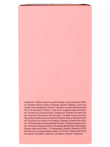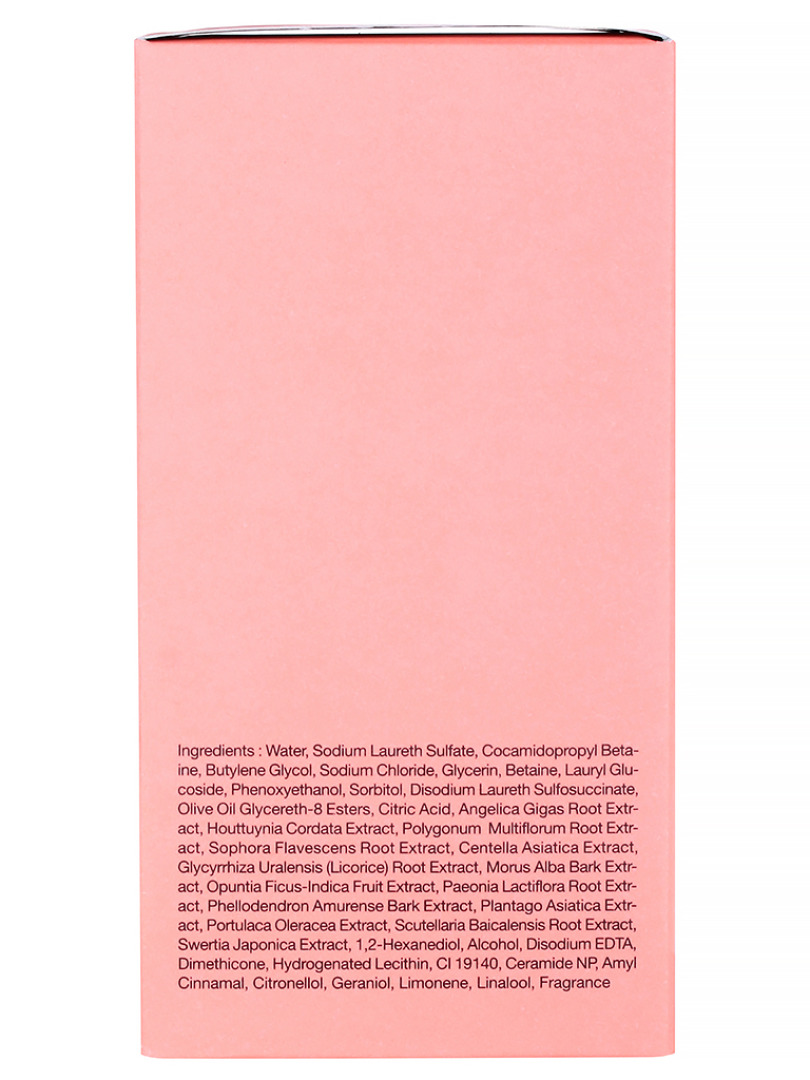 Water, Sodium Laureth Sulfate, Cocamidopropyl Betaine, Sodium Chloride, Butylene Glycol, Glycerin, Lauryl Glucoside, Alcohol, Disodium Laureth Sulfosuccinate, Sorbitol, Betaine, Sophora Flavescens Root Extract, Angelica Gigas Root Extract, Polygonum Multiflorum Root Extract, Houttuynia Cordata Extract, "Glycyrrhiza Uralensis (Licorice) Root, Extract", Scutellaria Baicalensis Root Extract, Centella Asiatica Extract, Morus Alba Bark Extract, Swertia Japonica Extract, Plantago Asiatica Extract, Opuntia Ficus-Indica Fruit Extract, Phellodendron Amurense Bark Extract, Paeonia Lactiflora Root Extract, Portulaca Oleracea Extract, 1,2-Hexanediol, Phenoxyethanol, Dimethicone, Hydrogenated Lecithin, Ceramide NP, Olive Oil Glycereth-8 Esters, Citric Acid, Disodium EDTA, CI 19140, Fragrance (Amyl Cinnamal, Citronellol, Geraniol, Limonene, Linalool)