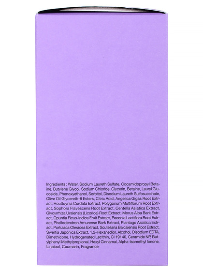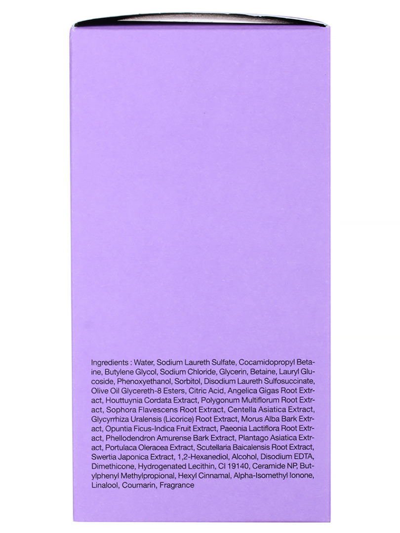 Water, Sodium Laureth Sulfate, Cocamidopropyl Betaine, Sodium Chloride, Butylene Glycol, Glycerin, Lauryl Glucoside, Alcohol, Disodium Laureth Sulfosuccinate, Sorbitol, Betaine, Sophora Flavescens Root Extract, Angelica Gigas Root Extract, Polygonum Multiflorum Root Extract, Houttuynia Cordata Extract, "Glycyrrhiza Uralensis (Licorice) Root, Extract", Scutellaria Baicalensis Root Extract, Centella Asiatica Extract, Morus Alba Bark Extract, Swertia Japonica Extract, Plantago Asiatica Extract, Opuntia Ficus-Indica Fruit Extract, Phellodendron Amurense Bark Extract, Paeonia Lactiflora Root Extract, Portulaca Oleracea Extract, 1,2-Hexanediol, Phenoxyethanol, Dimethicone, Hydrogenated Lecithin, Ceramide NP, Olive Oil Glycereth-8 Esters, Citric Acid, Disodium EDTA, CI 19140, "Fragrance (Butylphenyl Methylpropional, Hexyl Cinnamal, Alpha-Isomethyl Ionone, Linalool,, Coumarin)