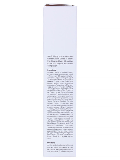 Morinda Citrifolia Fruit Extract, Glycerin, Methylpropanediol, Hydrogenated Poly(C6-14 Olefin), Methyl Trimethicone, Neopentyl Glycol Diheptanoate, Butyrospermum Parkii (Shea) Butter, Caprylic/Capric Triglyceride, Niacinamide, Trehalose, Polyglyceryl-3 Methylglucose Distearate, Cetyl Alcohol, Dimethicone/Vinyl Dimethicone Crosspolymer, Glyceryl Stearate Se, Morinda Citrifolia Seed Oil, Eclipta Prostrata Leaf Extract, Laminaria Japonica Extract, 1,2-Hexanediol, Water, Behenyl Alcohol, Centella Asiatica Extract, Ficus Carica (Fig) Fruit Extract, Hydrogenated Lecithin, Cetearyl Alcohol, Ethylhexylglycerin, Acmella Oleracea Extract, Polyglyceryl-10 Myristate, Rosmarinus Officinalis (Rosemary) Leaf Oil, Melia Azadirachta Leaf Extract, Adenosine, Butylene Glycol, Fructooligosaccharides, Sodium Stearoyl Glutamate, Malt Extract, Beta-Glucan, Cholesterol, Melia Azadirachta Flower Extract, Carbomer, Sodium Hyaluronate, Tromethamine, Hydrolyzed Hyaluronic Acid, Ceramide Np, Palmitic Acid, Aloe Barbadensis Leaf Extract, Althaea Rosea Flower Extract, Stearic Acid, Arginine, Myristic Acid