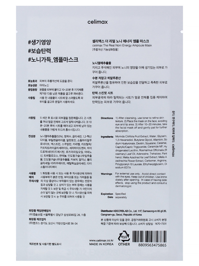 Изг-ль: ABSORBLAB Co., Ltd., 11F, Samseong-ro 85 gil 26, Gangnam-gu, Seoul, Республика Корея. Тканевая маска на основе нони для эластичности кожи пропитана высококонцентрированной эссенцией, которая интенсивно увлажняет, смягчает и восстанавливает, придавая гладкость и упругость. Продукт устраняет шелушение и сухость, устраняет тусклость и выравнивает тон. Содержит 52% экстракта нони, аденозин, сквалан, аллантоин и гиалуроновую кислоту. Способ применения: нанесите маску на лицо после очищения и тонизирования, снимите через 10-20 минут, похлопывающими движениями распределите остатки эссенции в кожу.