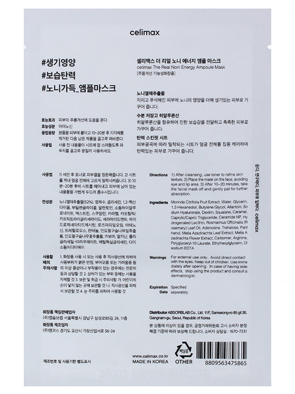 CLM Noni Маска для лица тканевая с экстрактом нони celimax The Real Noni Energy Ampoule Mask_1ea