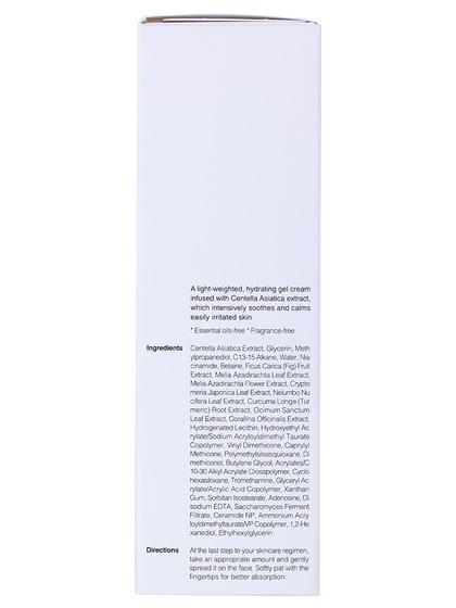 Centella Asiatica Extract, Glycerin, Methylpropanediol, C13-15 Alkane, Water, Betaine, Niacinamide, Hydroxyethyl Acrylate/Sodium Acryloyldimethyl Taurate Copolymer, 1,2-Hexanediol, Caprylyl Methicone, Polymethylsilsesquioxane, Vinyl Dimethicone, Dimethiconol, Butylene Glycol, Ficus Carica (Fig) Fruit Extract, Acrylates/C10-30 Alkyl Acrylate Crosspolymer, Cyclohexasiloxane, Tromethamine, Ethylhexylglycerin, Glyceryl Acrylate/Acrylic Acid Copolymer, Xanthan Gum, Sorbitan Isostearate, Adenosine, Disodium Edta, Melia Azadirachta Leaf Extract, Hydrogenated Lecithin, Melia Azadirachta Flower Extract, Cryptomeria Japonica Leaf Extract, Nelumbo Nucifera Leaf Extract, Saccharomyces Ferment Filtrate, Ceramide Np, Ammonium Acryloyldimethyltaurate/Vp Copolymer, Curcuma Longa (Turmeric) Root Extract, Ocimum Sanctum Leaf Extract, Corallina Officinalis Extract