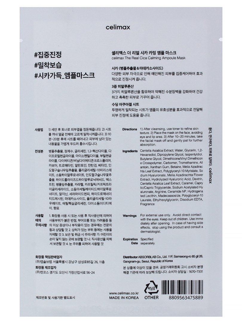 CLM Cica Маска тканевая для лица успокаивающая с экстрактом центеллы азиатской celimax The Real Cica Calming Ampoule Mask_1ea