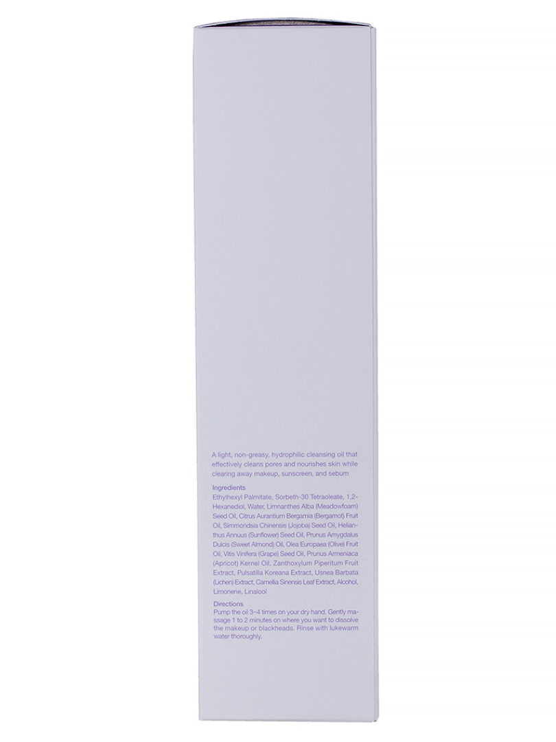 Ethylhexyl Palmitate, Sorbeth-30 Tetraoleate, 1,2-Hexanediol, Water, "Limnanthes Alba (Meadowfoam), Seed Oil", "Citrus Aurantium Bergamia, (Bergamot) Fruit Oil", "Simmondsia Chinensis (Jojoba), Seed Oil", "Helianthus Annuus (Sunflower), Seed Oil", "Prunus Amygdalus Dulcis (Sweet, Almond) Oil", Olea Europaea (Olive) Fruit Oil, Vitis Vinifera (Grape) Seed Oil, "Prunus Armeniaca (Apricot) Kernel, Oil", Zanthoxylum Piperitum Fruit Extract, Pulsatilla Koreana Extract, Usnea Barbata (Lichen) Extract, Camellia Sinensis Leaf Extract, Alcohol, Linalool, Limonene