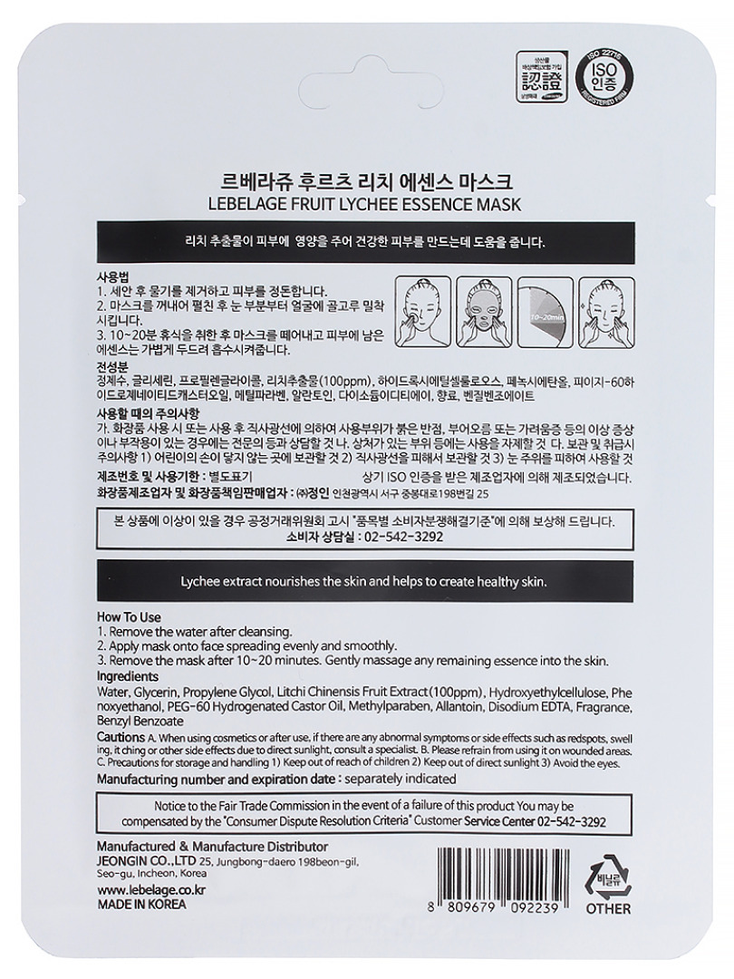 LBLG Маска для лица тканевая с экстрактом личи LEBELAGE FRUIT LYCHEE ESSENCE MASK