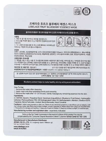 LBLG Маска для лица тканевая с экстрактом черники LEBELAGE FRUIT Blueberry ESSENCE MASK