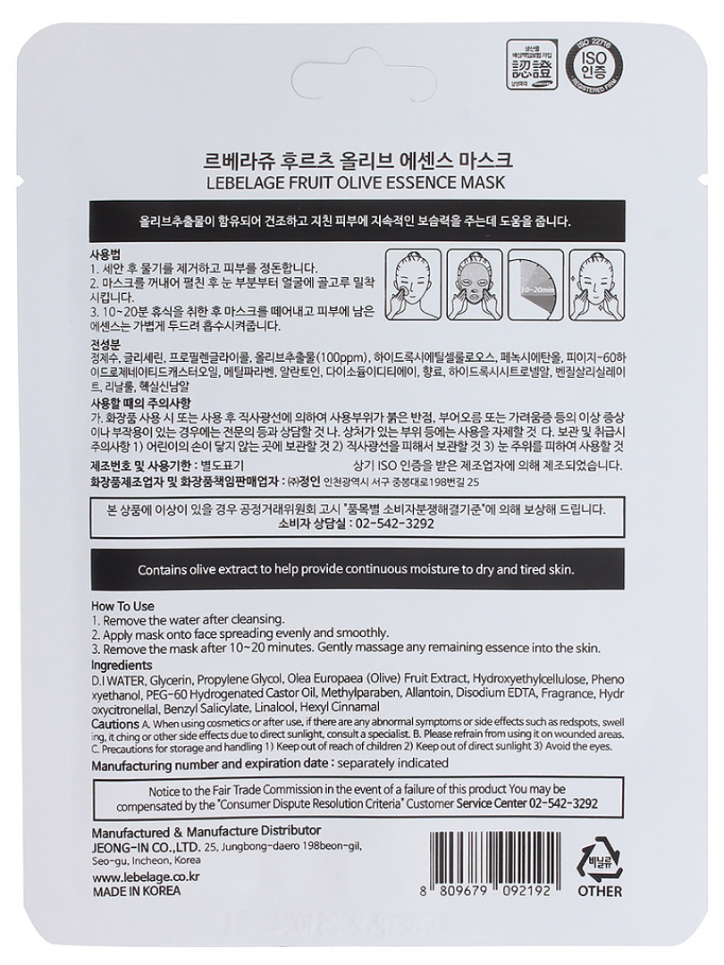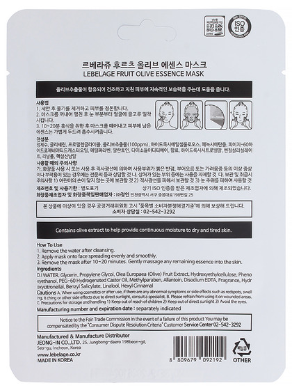 LBLG Маска для лица тканевая с экстрактом оливы LEBELAGE FRUIT OLIVE ESSENCE MASK