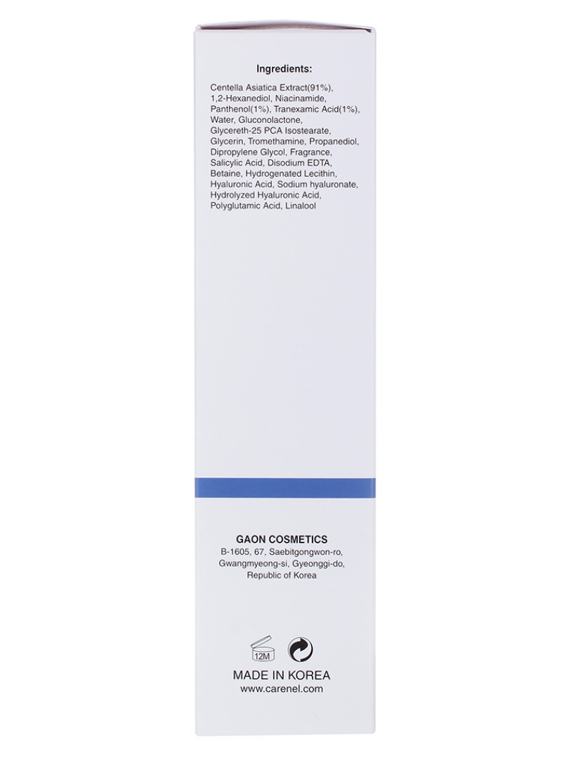 Изг-ль: GAON COSMETICS, B-1605, 67, Saebitgongwon-ro, Gwangmyeong-si, Gyeonggi-do, Республика Корея. Тонер для лица содержит экстракт центеллы азиатской 91%, транексамовую кислоту 1%. Средство оказывает мощный успокаивающий эффект, улучшает тон кожи, осветляет темные пятна и придает сияние, укрепляет ослабленный кожный барьер, также очищает от омертвевших клеток и избытка кожного сала, не раздрадает кожу и сохраняет здоровый тон. Способ применения: на предварительно очищенную кожу нанести необходимое количество тонера при помощи пальцев рук или же пропитать средством ватный диск и тщательно протереть поверхность лица.