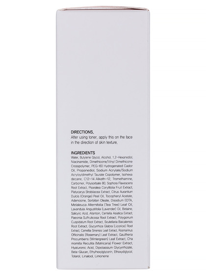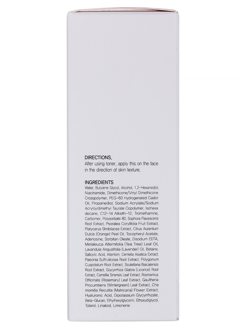 Water, Butylene Glycol, Alcohol, 1,2-Hexanediol, Niacinamide, Dimethicone/Vinyl Dimethicone Crosspolymer, PEG-60 Hydrogenated Castor Oil, Propanediol, Sodium Acrylate/Sodium Acryloyldimethyl Taurate Copolymer, Isohexadecane, C12-14 Pareth-12, Tromethamine, Carbomer, Polysorbate 80, Sophora Flavescens Root Extract, Psoralea Corylifolia Fruit Extract, Platycarya Strobilacea Extract, Citrus Aurantium Dulcis (Orange) Peel Oil, Tocopheryl Acetate, Adenosine, Sorbitan Oleate, Disodium EDTA, Melaleuca Alternifolia (Tea Tree) Leaf Oil, Lavandula Angustifolia (Lavender) Oil, Betaine, Salicylic Acid, Allantoin, Centella Asiatica Extract, Paeonia Suffruticosa Root Extract, Polygonum Cuspidatum Root Extract, Scutellaria Baicalensis Root Extract, Glycyrrhiza Glabra (Licorice) Root Extract, Camellia Sinensis Leaf Extract, Rosmarinus Officinalis (Rosemary) Leaf Extract, Gaultheria Procumbens (Wintergreen) Leaf Extract, Chamomilla Recutita (Matricaria) Flower Extract, Hyaluronic Acid, Dipotassium Glycyrrhizate, Beta-Glucan, Ethylhexylglycerin, Ethoxydiglycol, Totarol