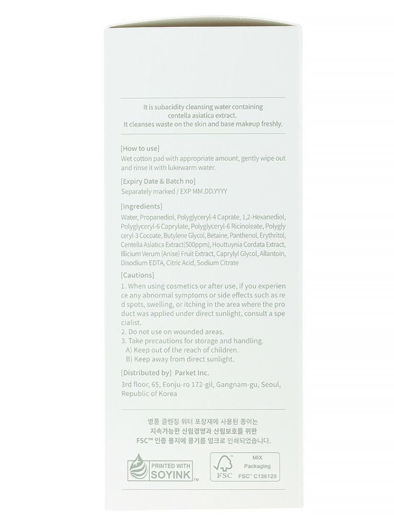 Изготовитель: Parket Inc., 3rd floor, 65, Eonju-ro 207-gil, Gangnam-gu, Seoul, Республика Корея. Очищающая вода мягко удаляет макияж и загрязнения. Средство с натуральным экстрактом центеллы азиатской эффективно успокаивает и увлажняет кожу лица, не оставляя сухости и раздражения после очищения. Легкий и освежающий продукт, созданный на основе природных ингредиентов, подходит для всех типов кожи. Способ применения: нанесите средство на ватный диск и протрите диском кожу лица.
