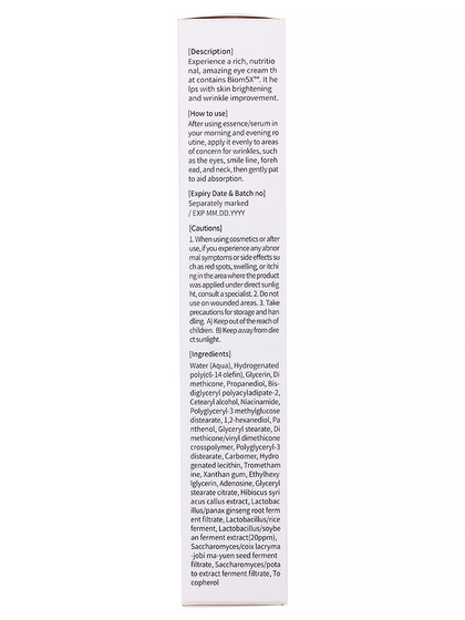 Изготовитель: Parket Inc., 3rd floor, 65, Eonju-ro 218-gil, Gangnam-gu, Seoul, Республика Корея. Увлажняющий крем для кожи вокруг глаз, в состав которого входит лактобактерии, рисовый фермент, экстракт соевого фермента. Средство обеспечивает успокаивающий эффект, минимизирует морщинки и ускоряет обновление клеток, также крем обогащен экстрактом гибискуса сирийского для улучшения увлажнения кожи и синтеза коллагена. Способ применения: после применения эссенции или сыворотки, нанести небольшое количество крема на кожу вокруг глаз и распределить его легкими похлопывающими движениями до полного впитывания.