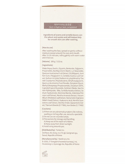 Изготовитель: Parket Inc., 3rd floor, 65, Eonju-ro 218-gil, Gangnam-gu, Seoul, Республика Корея. Маска для лица с 4 типами глины и пудрой, полученной из измельченного желудя, помогает удалить загрязнения и излишки себума, глубоко очищает и деликатно отшелушивает кожу, не вызывая сухости и раздражения. Средство с нежной формулой, включающей экстракты мяты, центеллы азиатской и гамамелиса, оказывает охлаждающее, увлажняющее и успокаивающее действие. Способ применения: после очищения лица распределите маску по сухой и чистой коже, избегая области губ и зоны вокруг глаз. Оставьте на 10-15 минут, затем смойте водой.