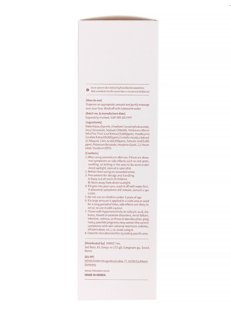 Water/Aqua, Glycerin, Disodium Cocoamphodiacetate, Decyl Glucoside, Sodium Chloride, Citric Acid, Salicylic Acid, Hexylene Glycol, Potassium Benzoate, 1,2-Hexanediol, Disodium EDTA, Houttuynia Cordata Extract, Melaleuca Alternifolia (Tea Tree) Leaf Extract, Centella Asiatica Extract