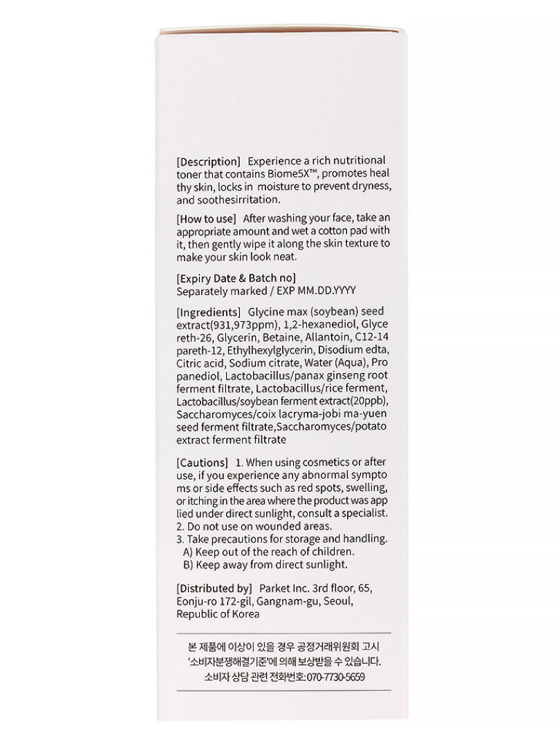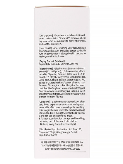 Изготовитель: Parket Inc., 3rd floor, 65, Eonju-ro 218-gil, Gangnam-gu, Seoul, Республика Корея. Успокаивающий тонер, обогащенный экстрактом соевых бобов, успокаивает и смягчает раздраженную кожу. Содержит бетаин, лактобактерии, фильтрат фермента корня женьшеня Panax, который обеспечивает мощный увлажняющий и омолаживающий эффект, придает коже упругость и молодость. Способ применения: после очищения кожи лица нанесите тонер на ватный диск и протрите диском лицо.