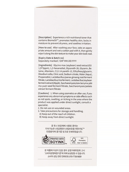 Water (Aqua), 1,2-Hexanediol, Glycereth-26, Glycerin, Glycine Max (Soybean) Seed Extract, Betaine, Allantoin, C12-14 Pareth-12, Ethylhexylglycerin, Disodium Edta, Citric Acid, Sodium Citrate, Propanediol, Lactobacillus/Panax Ginseng Root Ferment Filtrate, Lactobacillus/Rice Ferment, Lactobacillus/Soybean Ferment Extract, Saccharomyces/Coix Lacryma-Jobi Ma-Yuen Seed Ferment Filtrate, Saccharomyces/Potato Extract Ferment Filtrate