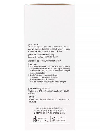 Изготовитель: Parket Inc., 3rd floor, 65, Eonju-ro 218-gil, Gangnam-gu, Seoul, Республика Корея. Успокаивающий тонер с экстрактом хауттюйнии создан на основе 100% экстракта хауттюйнии и отлично подойдет для ежедневного применения. Средство обеспечивает моментальное успокоение кожи, эффективно снимает воспаления и раздражения, насыщает кожу влагой, обладает высокими заживляющими качествами запускает процессы регенерации в эпидермисе, повышает иммунитет кожи и защитные функции. Способ применения: после очищения кожи лица нанесите тонер на ватный диск и протрите диском лицо.
