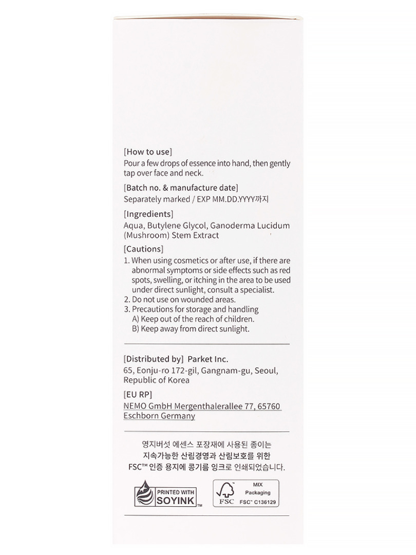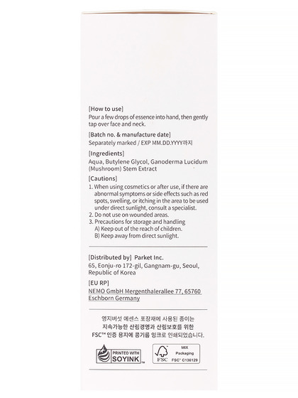 Изготовитель: Parket Inc., 3rd floor, 65, Eonju-ro 218-gil, Gangnam-gu, Seoul, Республика Корея. Эссенция с экстрактом гриба рейши, богатого белками, минералами и витаминами, глубоко питает кожу, повышая её гладкость и мягкость. Продукт дарит интенсивное, длительное увлажнение и улучшает состояние сухой, неровной и огрубевшей кожи. Гриб рейши также содержит ниацин, помогающий улучшить тон кожи и сделать кожу чистой и сияющей. Способ применения: нанесите небольшое количество эссенции на очищенную и тонизированную кожу подушечками пальцев или с помощью ватного диска.